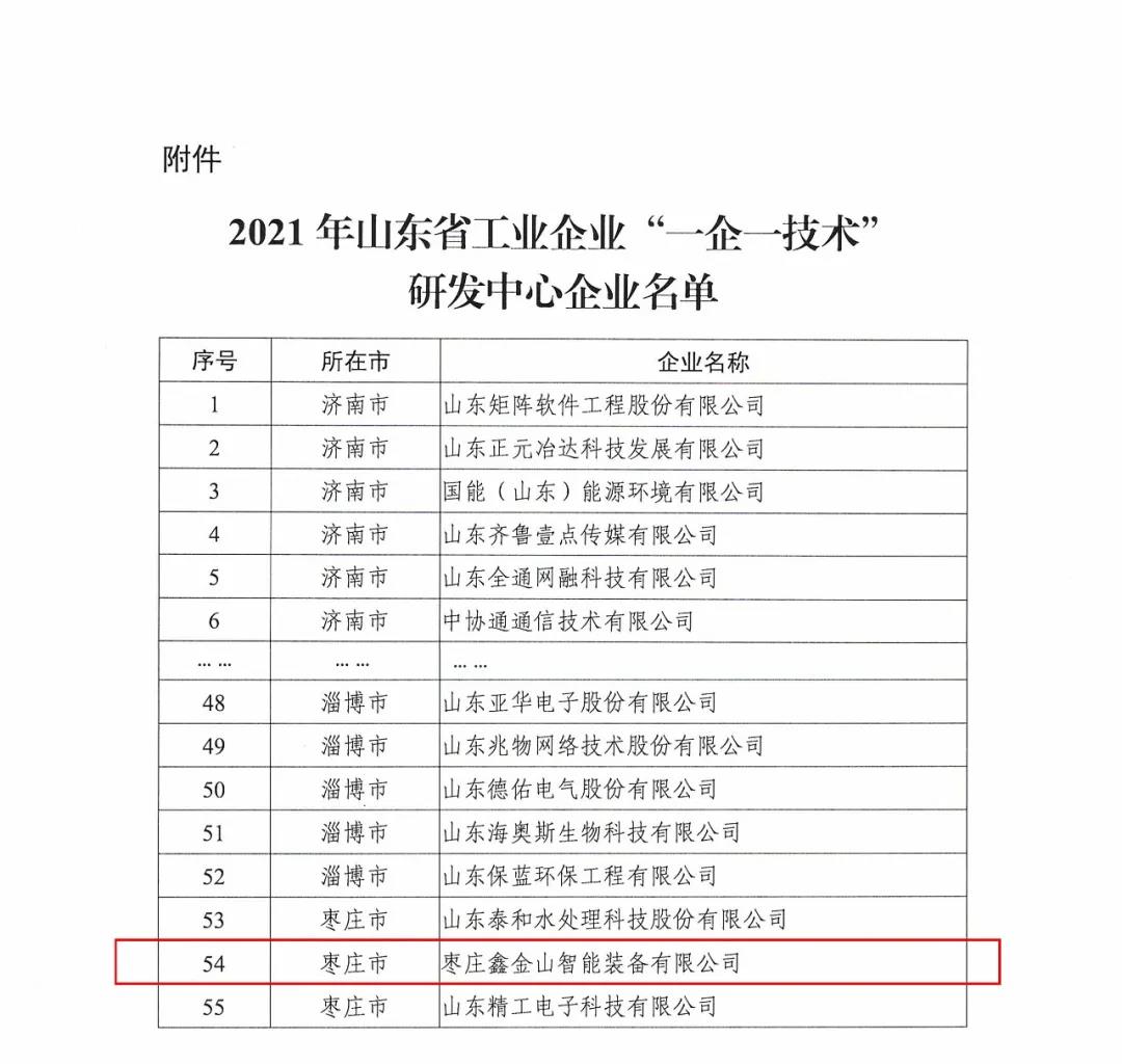 近日,山東省工業(yè)和信息化廳發(fā)布《關(guān)于公布2021年山東省工業(yè)企業(yè)“一企一技術(shù)”研發(fā)中心企業(yè)名單的通知》,棗莊鑫金山智能裝備有限公司成功入選,被認定為山東省“一企一技術(shù)”研發(fā)中心企業(yè)。這是繼院士工作站之后,鑫金山在技術(shù)研發(fā)領(lǐng)域獲得的又一項重要認定。
